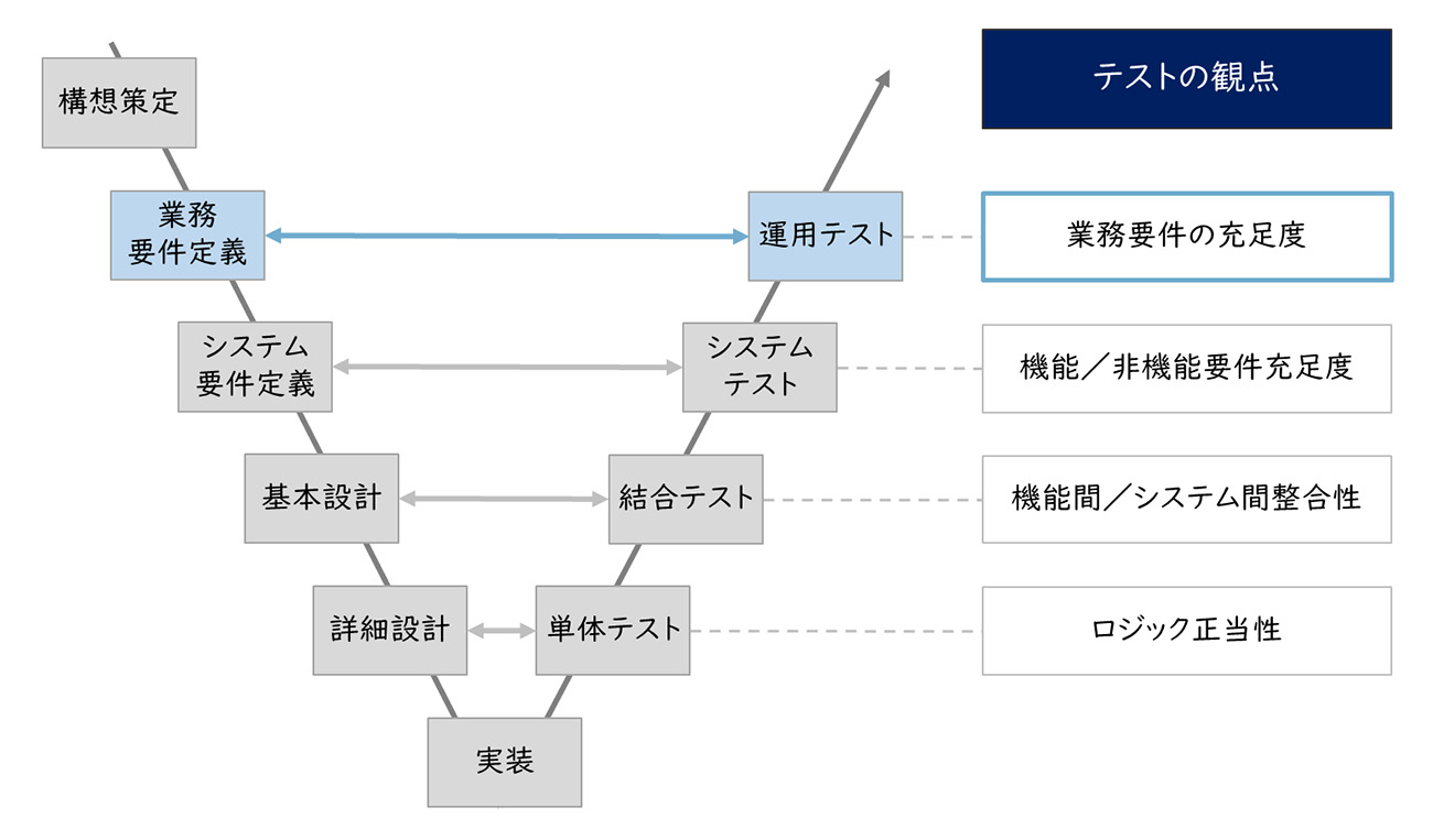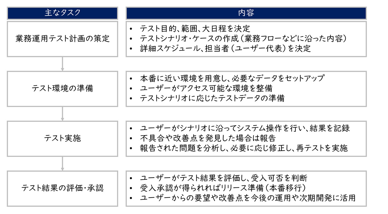 ※業務運用テストとユーザー受入テストは、厳密には異なりますが、ここでは同一のテストとして説明します。