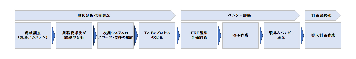 ここまで、ERP検討の進め方について考えてきました。当社では基幹システムの構想策定やERPの検討・選定に関する様々なコンサルティングを行っています。