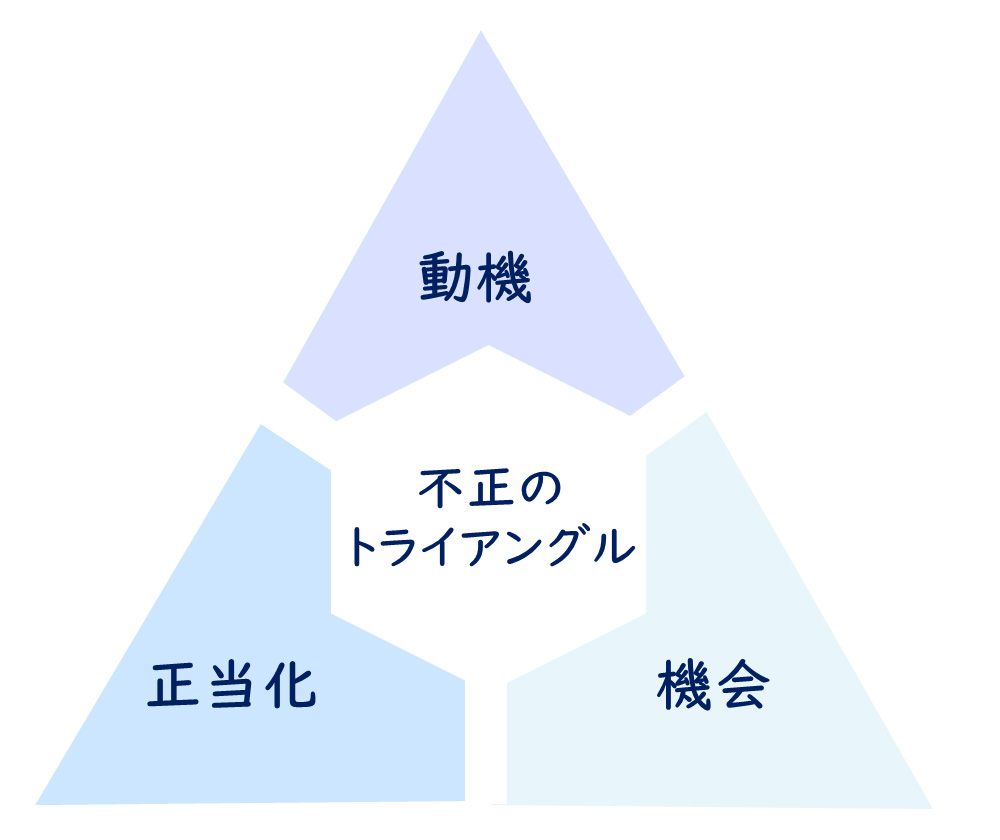 - 不正のトライアングル(動機・機会・正当化)により、不正は合理的判断の連続として進行する