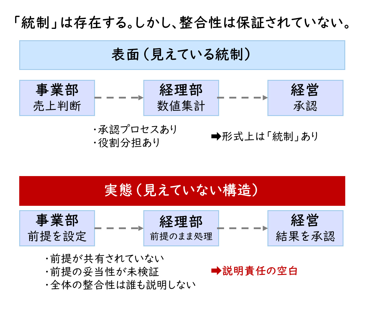 日本企業では、業務が精緻に分掌され、承認プロセスも多層的に設計されています。一見すると慎重で堅牢な仕組みに見えますが、その結果として「部分最適」が積み重なり、全体を俯瞰して説明できる主体が不明確になることがあります。各部門はそれぞれの責任範囲では正しい判断をしているつもりでも、数値全体の整合性については誰も主体的に説明しきれない。この状態こそが、構造的なリスクです。形式上は適切に承認されていても、実質的な説明責任の所在が曖昧になっていることは珍しくありません。