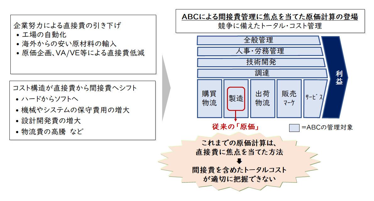 したがって、企業経営においては製品サービスの製造原価だけでなく、マーケットに提供するまでのトータル・コストをいかに効率的に設計・実現させるかが非常に重要になってきています。そこで、購買→製造→出荷→マーケティングサービスといったプロセス全般に関してのコストマネジメントが必要となり、活動基準原価計算(Activity-Based Costing、略称ABC)が生まれました。