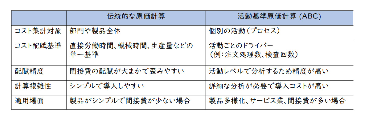 伝統的原価計算と活動基準原価計算の違いは下記のとおりです。