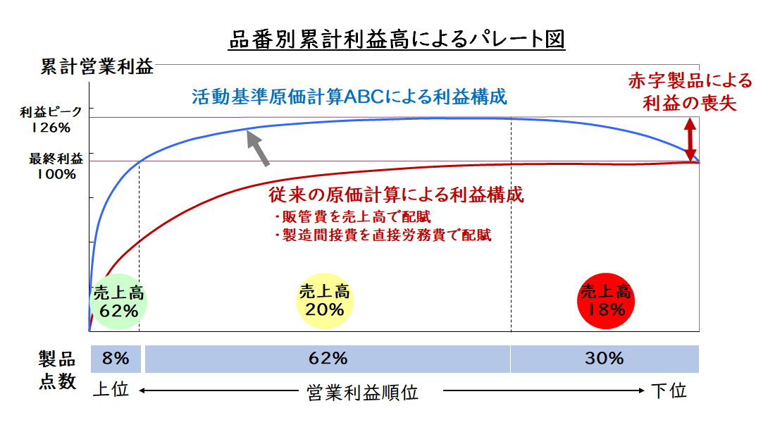 そこで、活動基準原価計算を採用し、各活動別にコストを集計し、活動コストに基づき製品へコスト負担する方式に変更しました。その結果、2割の製品が営業利益で赤字であり、最大利益の26%を食いつぶしていることが判明しました。そこで、2割の製品については取引先に価格交渉を行い、新価格が受け入れられれば取引を継続しましたが、受け入れられない場合には取引を取り止め、代替品等への切り替えを推奨しました。