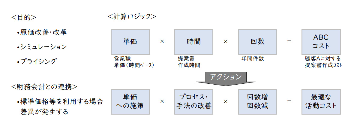コスト積上方式とは、活動コストを単価×活動量(回数・数量等、複数あり)に分解し、実際の単価や活動量を摘要して活動コストを積み上げる方式です。