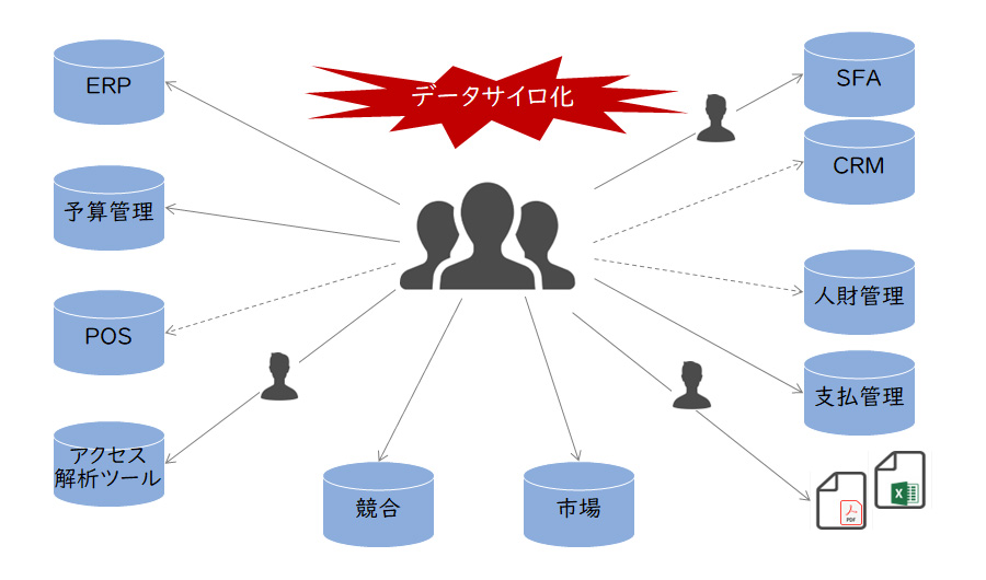 経営会議の資料を作るために、各部門からExcelファイルを集め、集計作業に追われる…といった光景が繰り広げられている会社もまだまだ多いのではないでしょうか。ERP、SFA/CRM、POSシステム、Web解析ツールなど、それぞれのシステムが持つデータは貴重な資産です。しかし、それらがバラバラに管理されている「サイロ化」状態では、部門ごとにデータの定義が異なったり、更新のタイミングがずれていたりするため、いざという時に信頼できる情報として活用することができません。
