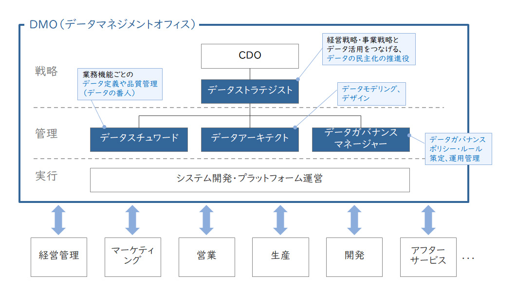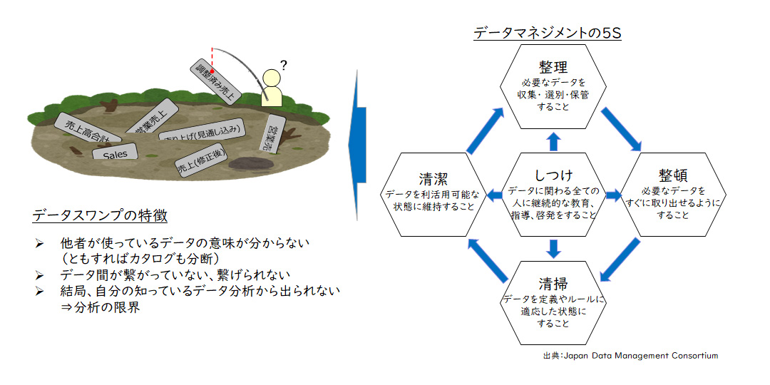 - 「データの沼」を防ぐ:データマネジメント(5S)とデータガバナンスを整備し、データスチュワード/DMOで品質を維持してデータの民主化を実現