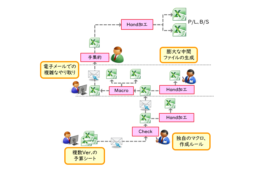 - Excelバケツリレー:複数のExcelファイルを手渡しで連携する非効率な作業。属人化やバージョン管理の破綻が計画策定の遅延を招き、経営判断のスピード低下を引き起こす。