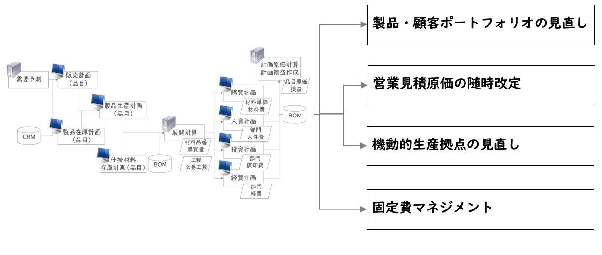 - 予実差異・シミュレーションの活用: PDCAサイクルの強化と、製品ポートフォリオ見直しや固定費マネジメントなど経営改善への応用。