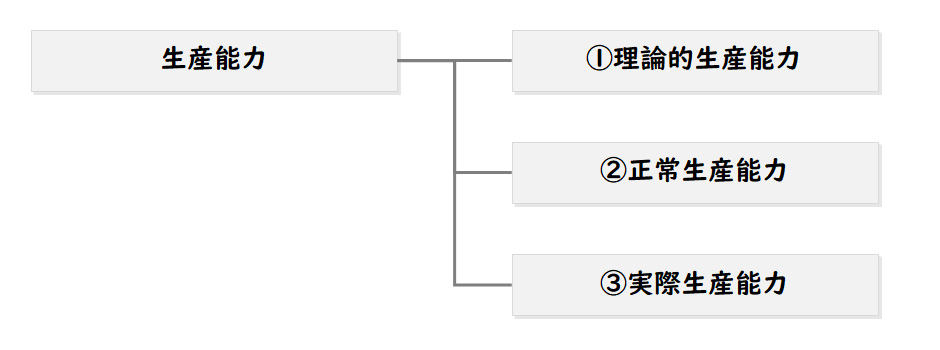 先ほど説明したように、「固定費は製品を生産するための能力を維持するコスト(キャパシティ・コスト)だから、製造部門の能力を使って生産される製品が負担すべき」とする考え方では、製造部門の生産能力の捉え方が問題になります。製造部門の生産能力の捉え方としては、①その生産設備等の最大限の生産能力を前提とする考え方(理論的生産能力)、②異常な状態を除いて経営における正常な状態における生産能力を前提する考え方(正常生産能力)、③実際に使った生産能力を前提とする考え方(実際生産能力)などがあります。