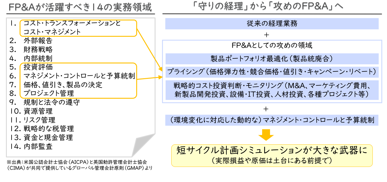 - FP&A:財務・経理の意思決定機関。その役割は、従来の経理業務や過去実績の整理、つまり「守りの経理」から未来予測と戦略立案を担う「攻めの参謀」へ進化。