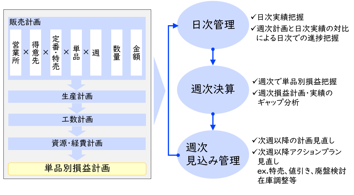 これを実現するのが「週次決算・週次予測」の仕組みです。単品別の損益を週次で把握し、計画とのギャップがなぜ生まれたのか(価格、数量、構成比、販促費…)を即座に分析。その結果を基に、翌週の特売・キャンペーン・在庫配置といったアクションプランを見直すのです。この高速ループを回し続けることで、変化の兆候を逃さず、常に先手を打つことが可能になります。