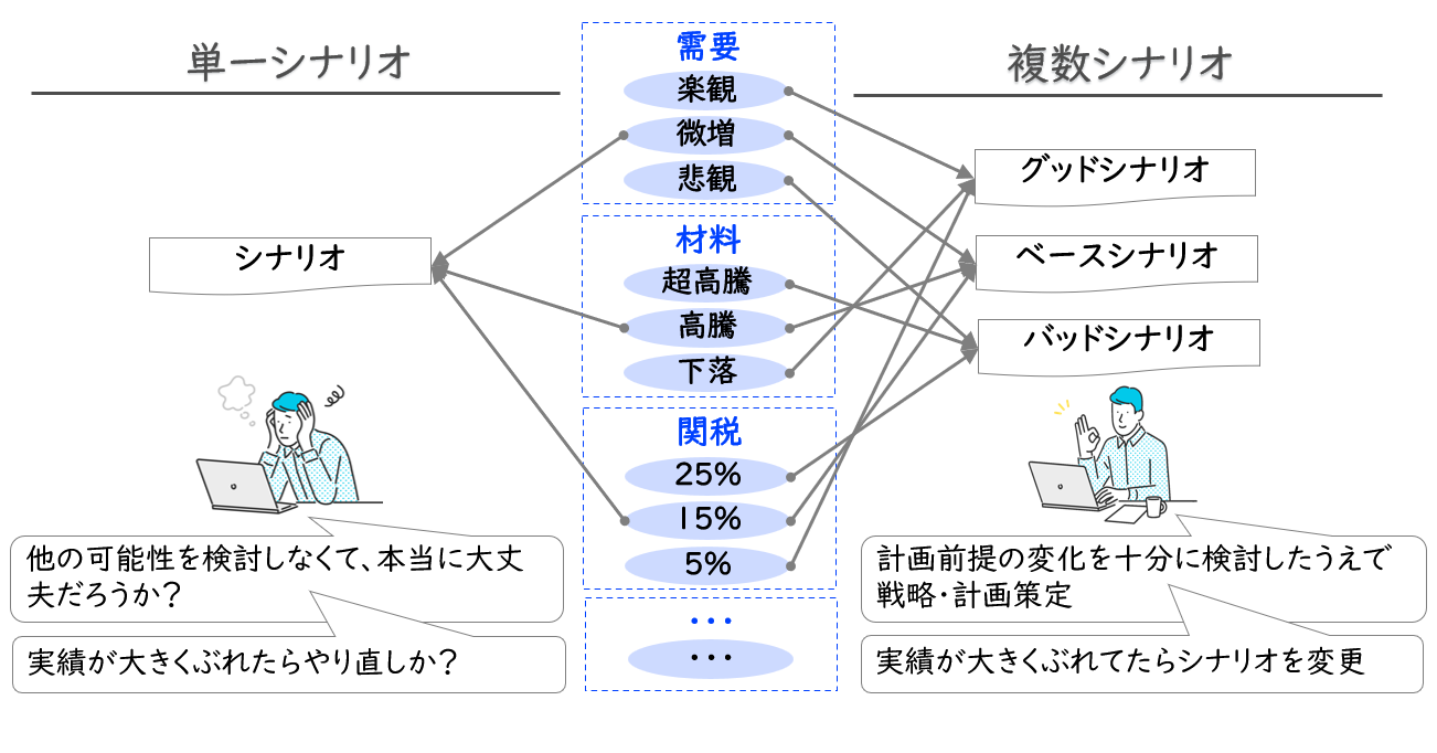 「計画の前提は一つ」という考え方は、もはや大きなリスクです。もし、為替が想定外に変動したら?主要な材料費が急騰したら?特定の国との間で突然関税が引き上げられたら?こうした不測の事態に備え、あらかじめ複数のシナリオを準備しておくことが、経営のレジリエンス(強靭性)を高めます。