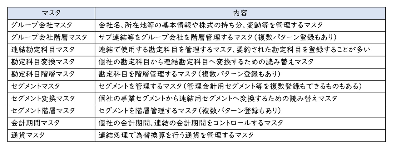 登録するマスタ類や設定項目等は、連結会計サブシステムごとに異なるため、導入時に確認が必要です。