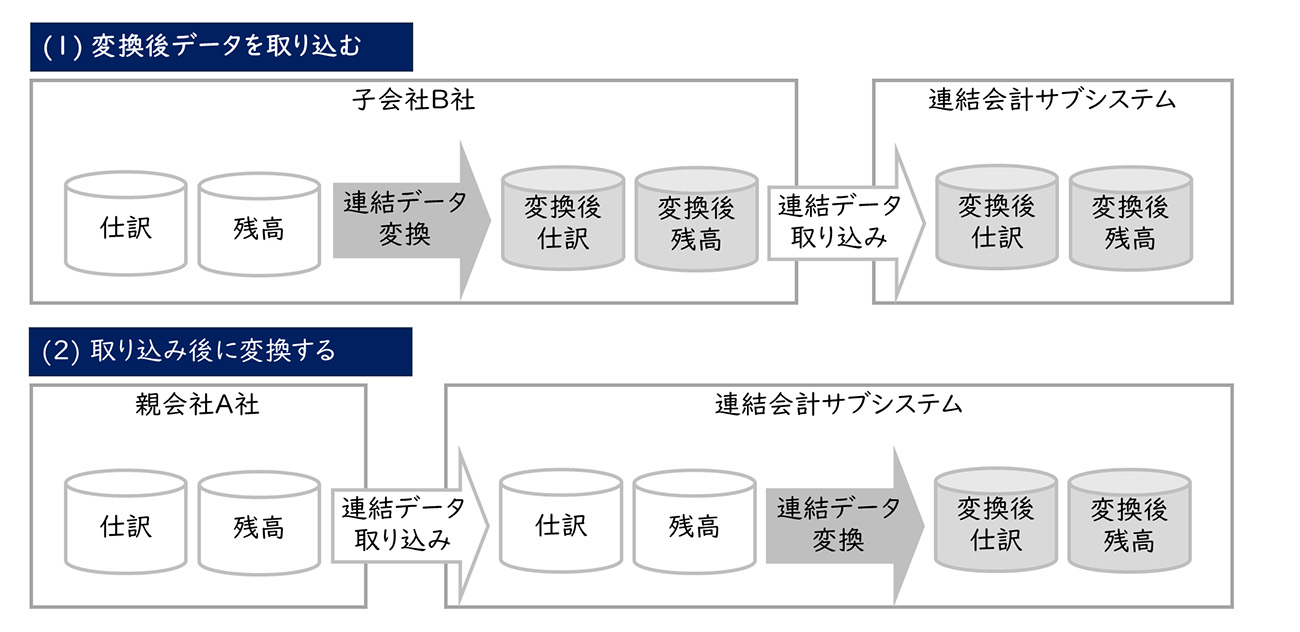 (2)会計システムからの元データを連結会計システムに取り込み、連結会計システム側で変換する