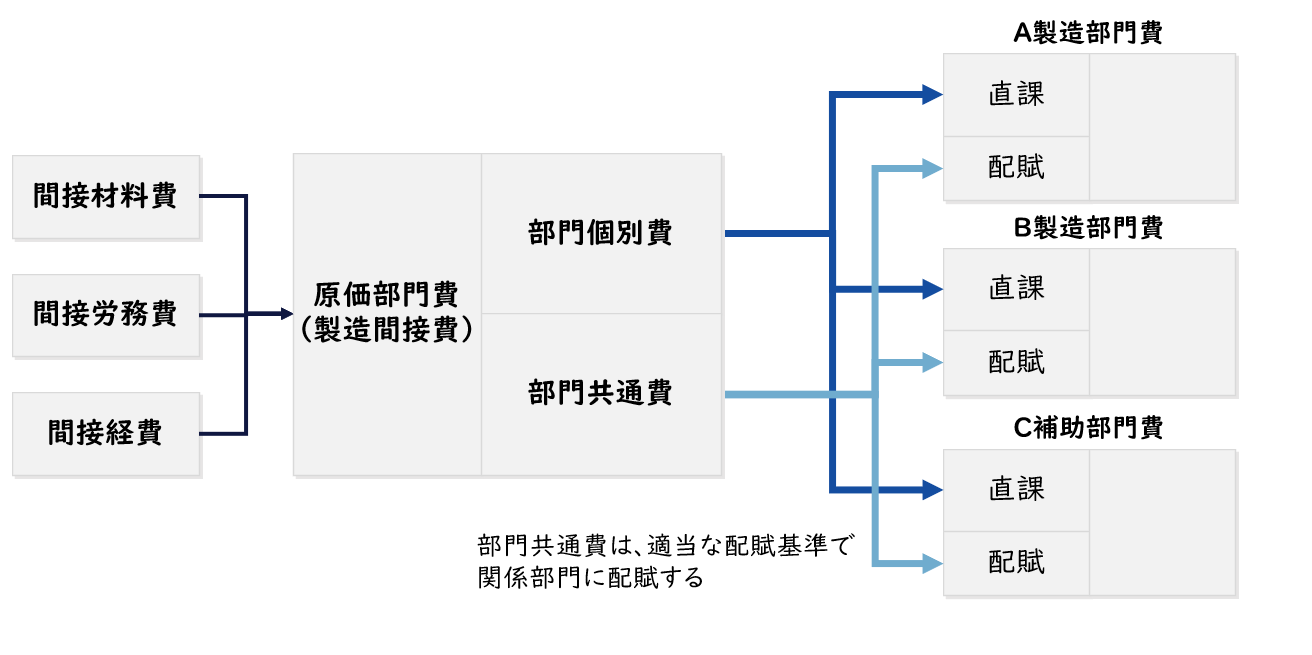 ※製造間接費(間接材料費、間接労務費、間接経費)に直接労務費を加えた加工費として配賦する場合もあります。