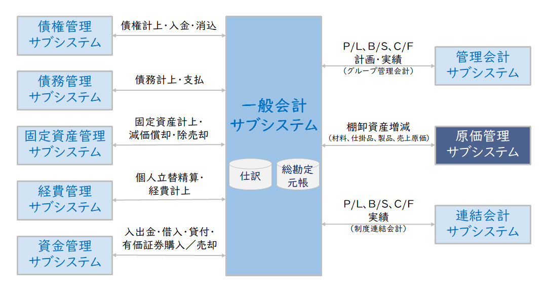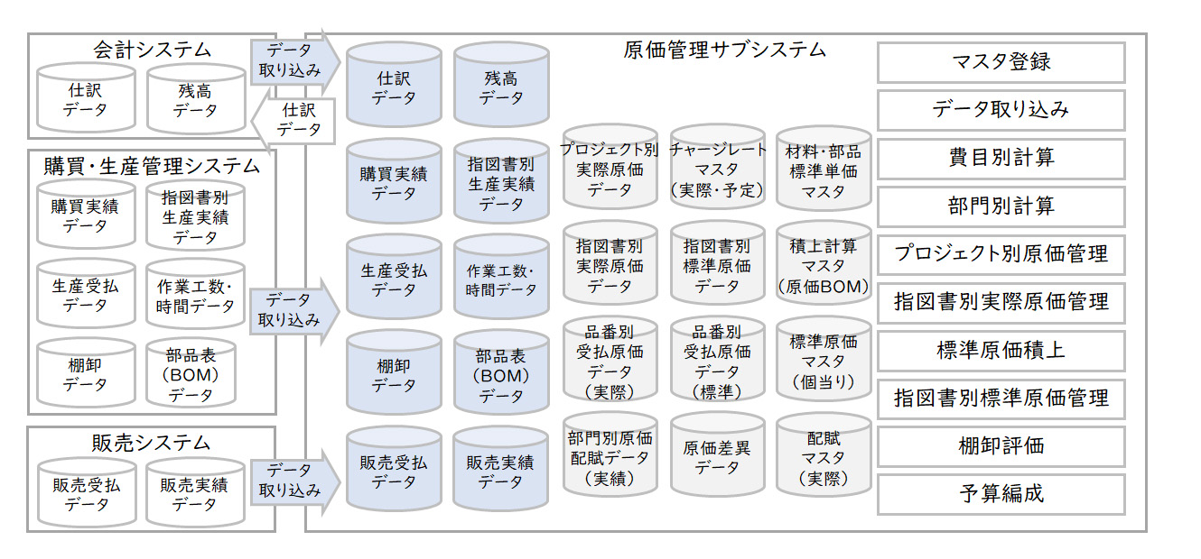 会計システムや購買・生産システム等から必要データを取り込み、原価管理サブシステムで費目別計算、部門別計算、製品別計算を行い、棚卸資産・売上原価・損益関連の仕訳を会計システムに連携します。