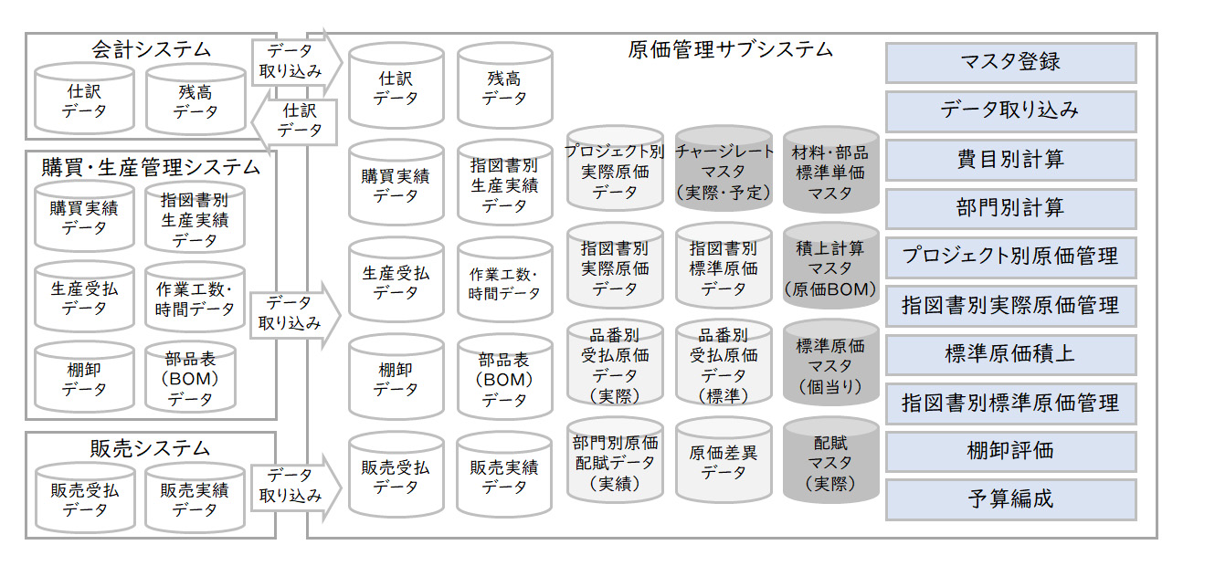 ※原価計算サブシステムには、予算編成機能(予算段階での部門別計算や原価を配賦するための予定チャージレート計算等)があるものもありますが、今回は割愛します。
