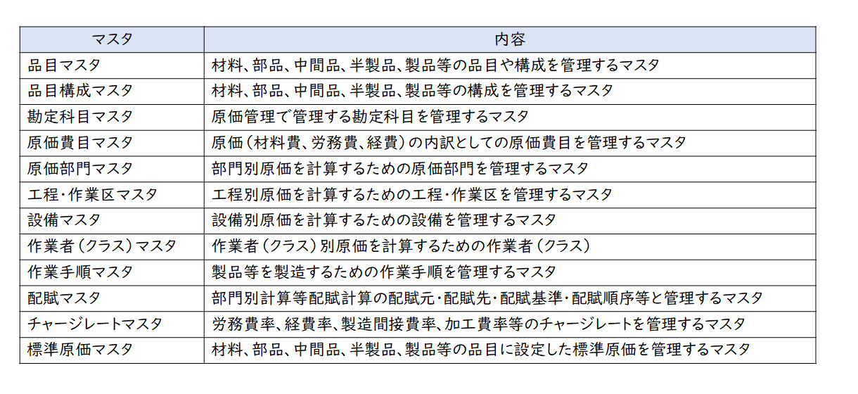 原価管理サブシステムを利用するためには、下記のマスタを登録することが必要です。マスタ登録は、ユーザーが画面等から登録する方法とシステム的にインターフェースする方法があります。