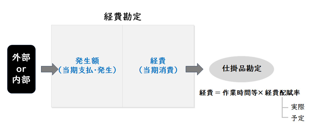 経費において、直接経費はその経費を消費した仕掛品に直課し、間接経費は作業時間等の配賦基準に基づいて経費率(チャージレート)を算出し、これに作業時間等を掛けて計算します。
