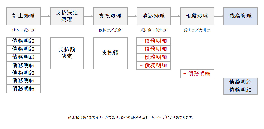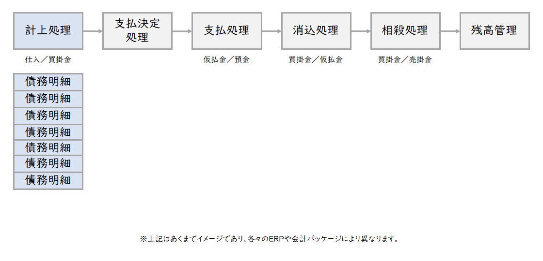 - 主要機能の全体像:債務明細を起点に、計上処理→支払決定処理(締め処理)→支払処理→消込処理→相殺処理→残高管理を一連で理解