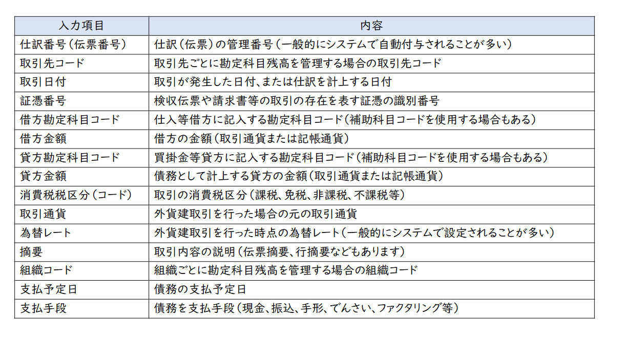 入力項目のうち、借方・貸方の勘定科目、支払予定日、支払手段、支払口座等については、取引先ごとに取引先マスタに事前に登録したり、入力時に伝票タイプ等を指定したりすることにより、システムがデフォルト値を設定する場合もあります。債務計上の入力項目は、ERPや会計パッケージによって異なるので、どのような項目が入力できるか、どの項目が必須項目か任意項目かなどの確認が必要です。