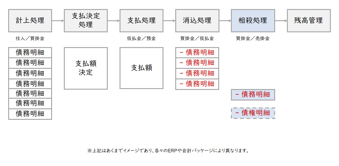 ※説明上ここでは債務の最後のプロセスとしていますが、通常の取引で常に債務>債権の場合は、債務の支払決定段階が多いようです。