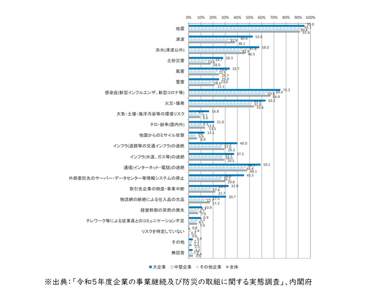 しかしその一方で、多くの企業のBCPは依然として大規模災害への対応を中心に設計されており、移行等によるシステムの障害やサイバー攻撃といったITリスクに焦点を当てたIT-BCPを十分に整備している企業は限られます。内閣府の同調査でも、BCPを策定している大企業のうち、ITリスクを想定している割合は約半数にとどまり、中堅企業ではそれ以下という結果が示されています。今後は、従来型BCPに加えて、ITリスクへの対応を含む、実践的なIT-BCPの策定と運用が求められます。
