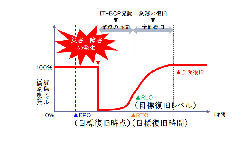 IT-BCPは、大規模災害、重大なシステム障害、サイバー攻撃などの緊急事態に直面した際でも、企業が重要業務を中断させることなく維持し、迅速に復旧するための基盤となる取り組みです。災害や障害が発生し、システムの継続利用が困難になった場合、システム停止後にどの程度の時間(RTO、目標復旧時間)でシステム障害前のどの時点(RPO、目標復旧時点)に対してどのレベル(RLO、目標復旧レベル)で最低限復旧されるべきかの基準と手順の整備が重要となります。IT-BCPの策定においては、単なる文書化にとどまらず、事業への影響度分析、重要業務の優先順位付け、代替手段や復旧プロセスの明確化、関係部署や外部パートナーとの連携体制の整備といった、実効性をともなう仕組みの構築が必要不可欠です。