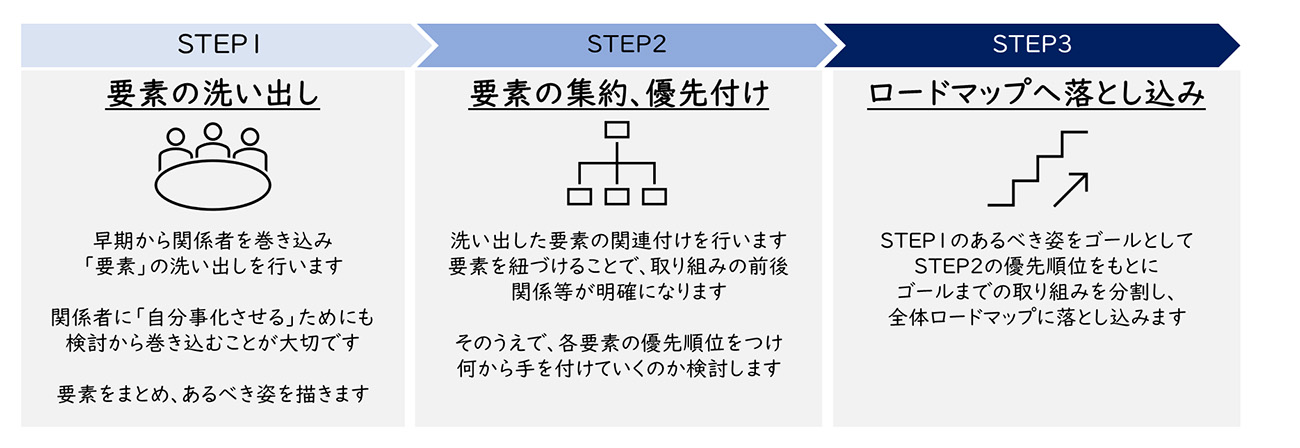 ②でまとめた優先順位をもとにSTEPごとの実施施策・実現したい姿を定義し、あるべき姿実現までの全体ロードマップを作成します。