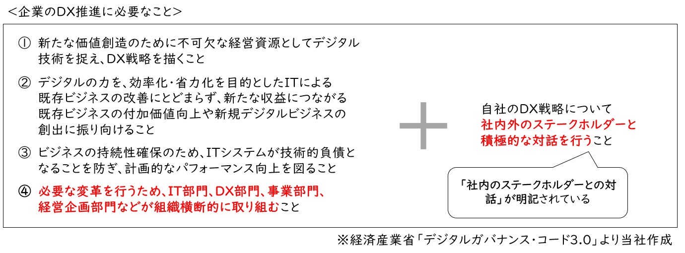実際に、2024年に改定された経済産業省の「デジタルガバナンス・コード3.0」においても、DX推進による持続的な企業価値の向上を図るためには、「組織横断的な取り組み」と「社内外のステークホルダーとの積極的な対話」が重要と述べられています。したがって、本社・IT部門だけでなく、「現場の理解・協力を得ること」が成功のカギとなります。