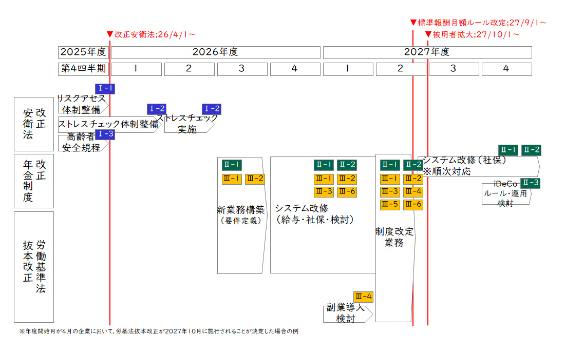 - 2026年4月施行の労働安全衛生法・年金制度改正への実務対応:個人事業者への安全衛生措置拡大、ストレスチェック義務化、被用者保険適用拡大における企業規模別の準備スケジュール