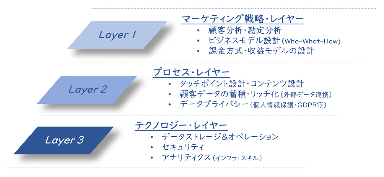 推し活マーケティングを自社に導入するためには、場当たり的な施策ではなく、全体を見据えた体系的なアプローチが不可欠です。成功のためには、「戦略」「プロセス」「テクノロジー」の3つの階層(Layer)で段階的に取り組むことが重要です。