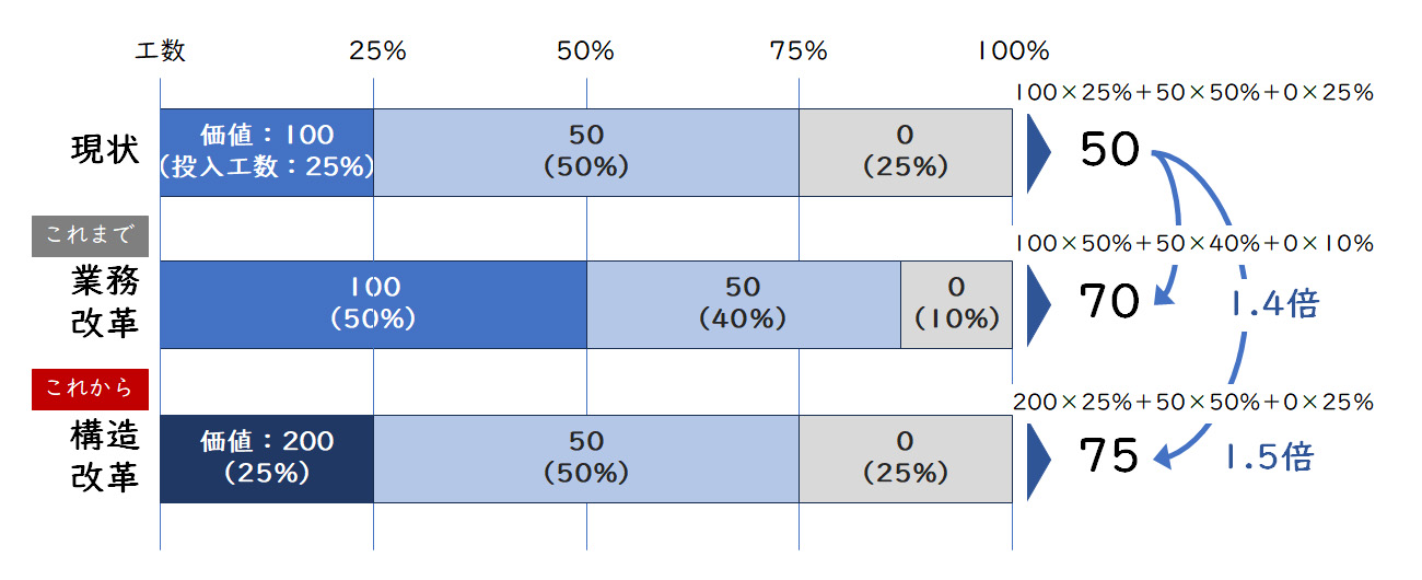この関係を下の図で簡潔に示します。現状ある従業員が付加価値の高い業務(価値が100の業務)に全体の工数の25%しか投入できておらず、50%の工数を価値の高くない業務(価値が50)へ、さらに25%の工数を価値のない雑務等の業務(価値がゼロ)へ投入しているとします。従来の業務改革は業務別に投入している工数の割合を見直し、価値の高い業務へ重点的に投入するように変更する(価値が100の業務へ工数の50%を投入する)ことで、この従業員の生産性を高めていました。一方で、未来志向の改革では、業務別の工数配分は現状のままでも、業務の付加価値自体をさらに高めることで生産性を上げることを目指すものです。