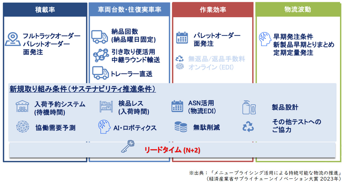 - 早期発注条件を全国的に導入し、リードタイムがもたらす効率化(物流波動の調整、タッチポイントを減らした直送等)を促進する