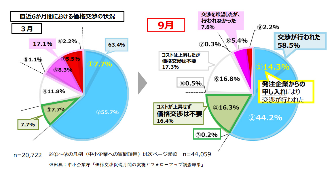 補足ですが、今日の円安や物価高、人件費の上昇等の環境変化により、政府や経済界でも従来の取引条件や価格の見直しが推奨されており、取引先に見直し交渉のテーブルに着いてもらえる機運が醸成されていると考えます。実際に、経済産業省・中小企業庁では3月・9月を「価格交渉促進月間」と位置づけ、価格交渉の状況をモニタリングしています。2023年3月・9月の調査において価格交渉が行われた割合はいずれも約60%となっています。