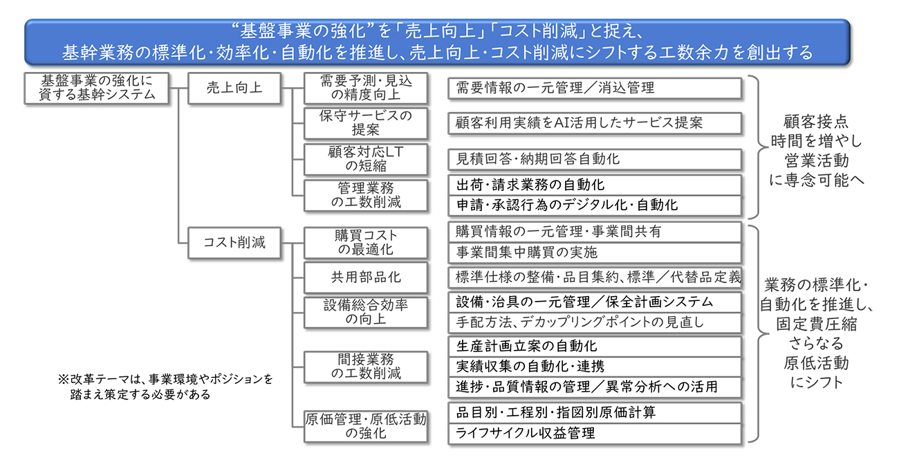- 「基盤事業の強化」を、売上向上/コスト削減のKPIに分解して改革テーマへ落とす