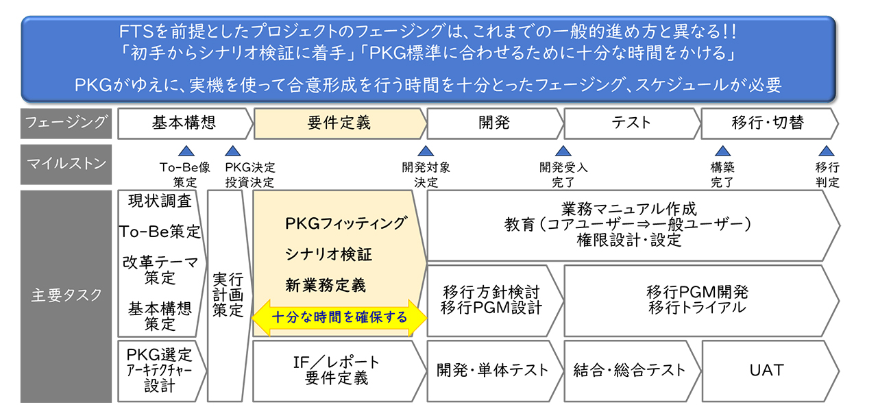 FTSは、標準機能に業務を合わせるため、検討・合意に時間がかかります。しかしここを急ぐと、例外処理が増え、アドオンが雪だるま式に増えます。