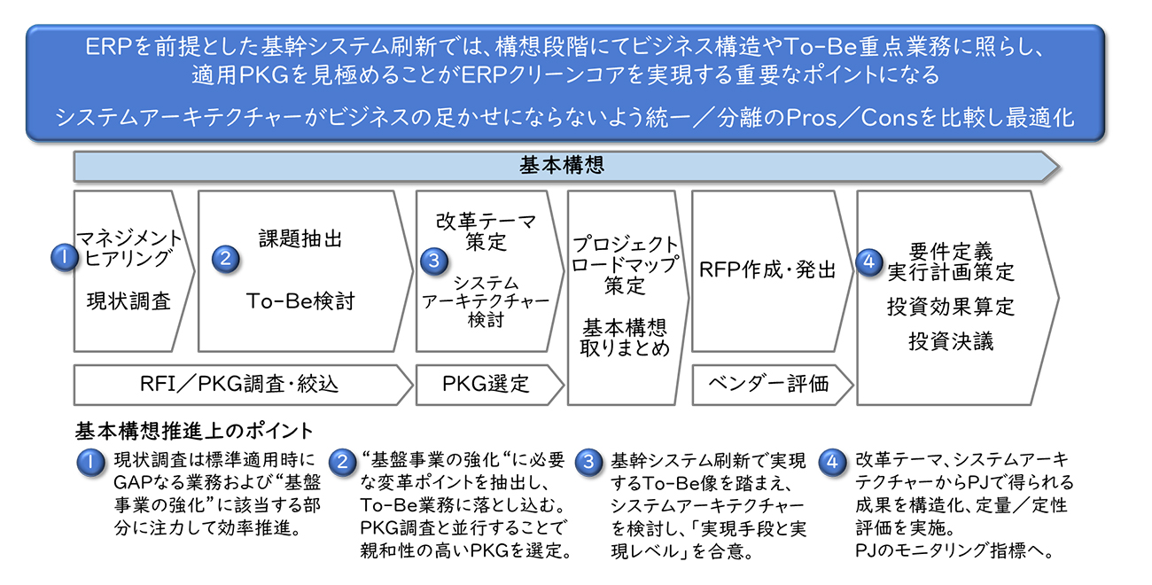 - 基本構想のKSF(成功要因)とChallenge(難所)を押さえ、将来像・変革定義と PKG選定、アーキテクチャー設計で実行力を担保する。