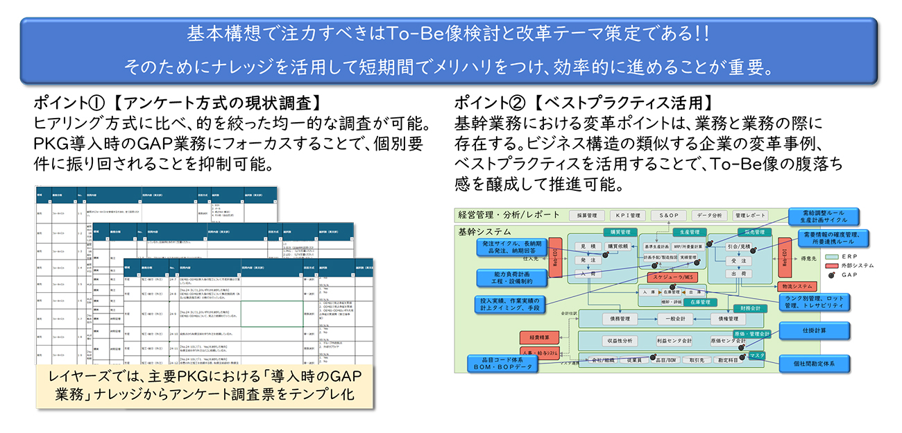 そこで有効なのが、作業のメリハリ化とナレッジ活用です。作業ボリュームの大きくなりがちな現状調査は、アンケート方式での現状調査が有効です。ユーザー部門に割り振ることで並列作業が可能になり、時間効率を有効に扱えます。また、To-Be像の検討や改革テーマの策定は、利害関係者の意見を統一し進むべき方向を定める必要があります。類似企業の事例やベストプラクティスを活用することで、実現イメージの共通認識を図り、To-Be像への腹落ち感を醸成しながら進めることが、難しい意思決定を前に進める武器となります。