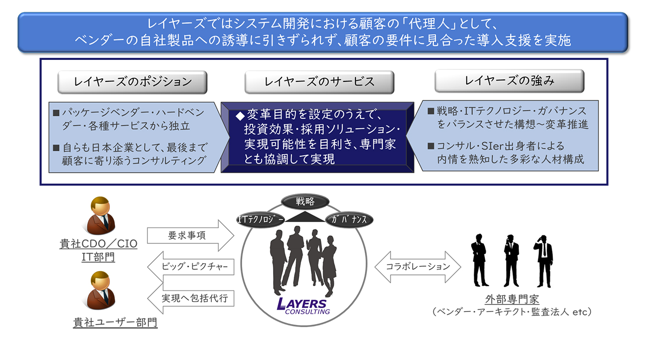 基幹システム刷新は、基本構想から移行・定着まで「判断」と「合意」を積み重ねる取り組みであり、社内だけで完結させるには負荷が大きいのが実情です。レイヤーズ・コンサルティングでは、基本構想の進め方やRFP設計、FTS判断基準の整理から、第三者として最後までしっかり伴走させていただきます。