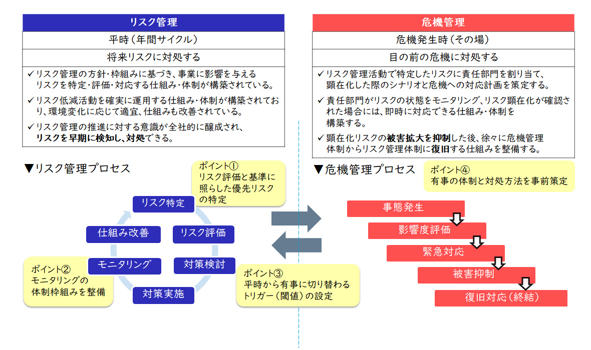 リスク管理は平時に年間サイクルで実施する、将来リスクを早期に検知して対処する取り組みとなります。リスクの特定、評価、対策の実施、モニタリングを含むPDCAサイクルを回すことが求められます。一方、リスクが顕在化し危機が発生したときにいかに対処するのが危機管理との考え方になります。発生した事態の影響度を評価し、緊急対応で被害を抑制し、その後復旧するという流れになります。