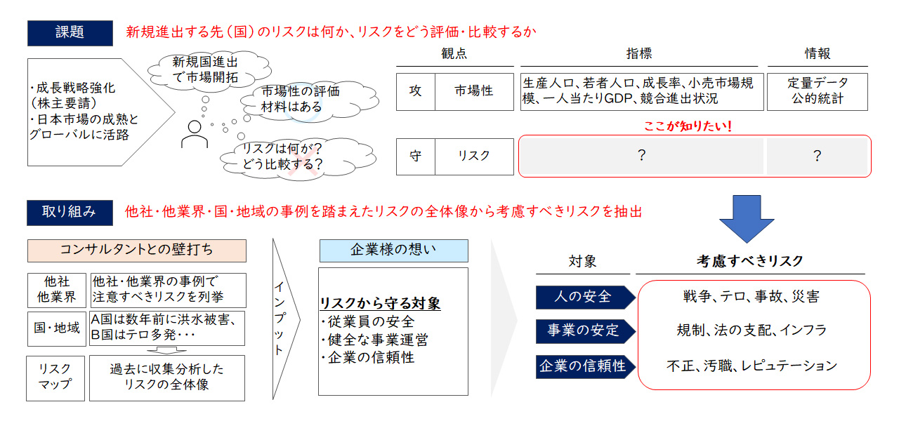 グローバルな事業展開にリスク管理の視点を組み込んだ一例として、大手小売企業の新興国市場進出の事例があります。この小売企業は、株主・投資家からの成長戦略強化の要請を受けて、さらなる成長のために、成熟した日本市場ではなくグローバルに活路を求め、これまで未開拓だった新興国への進出を検討していました。攻めの市場の有望性についてはGDP成長率、生産人口や若者人口、小売市場規模、同業他社の進出状況など評価材料がそろっていた一方で、進出先候補となる新興国に存在するリスクを評価するための情報が不足していました。そこで、リスクの洗い出しを行い、国際的な指標を活用してリスクをスコア化し、ポートフォリオを作成しました。