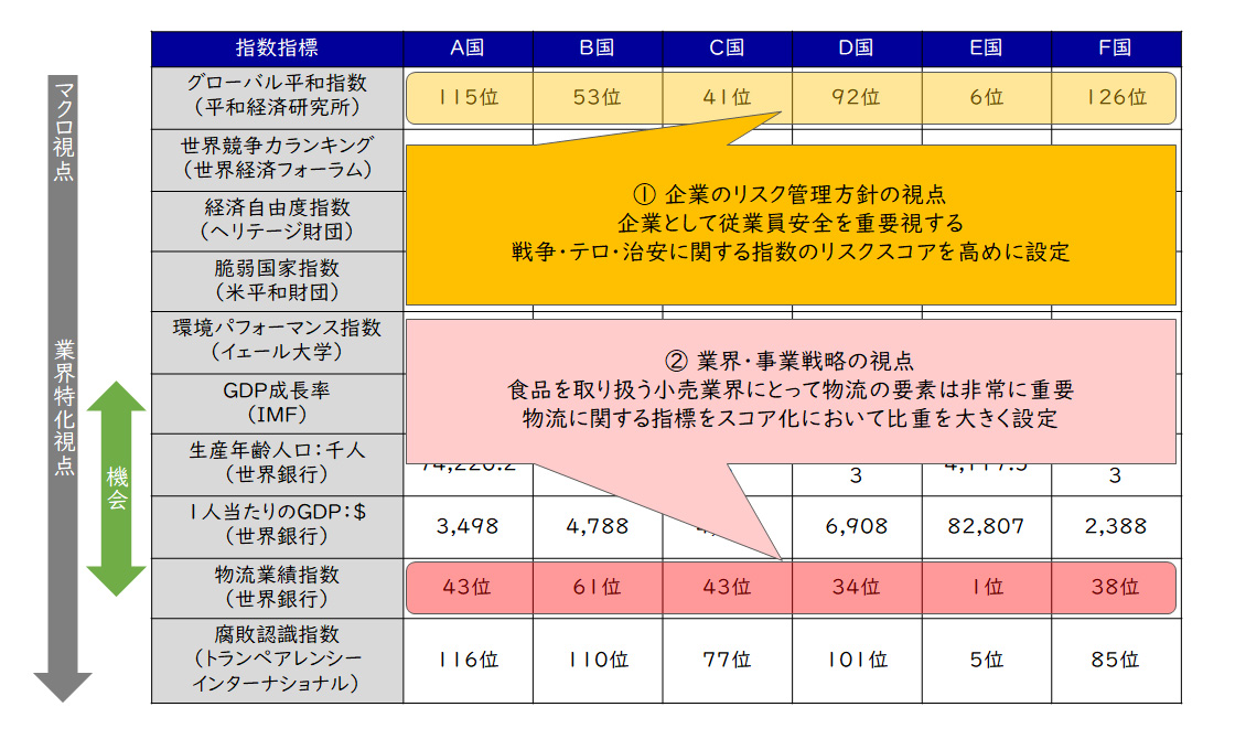 進出先を選定するにあたっては国ごとのリスクをスコア化し、定量的に比較することが必要となります。大手小売企業においては、抽出した同社の事業に対するリスクをすでに存在する様々な国際指標、カントリーリスクに関する数値をデータベース化したうえで独自の係数で計算しスコア化しました。例えば戦争・テロといった安全事項についてはグローバル平和指数、物流インフラであれば世界銀行の物流パフォーマンス指数などを活用しました。
