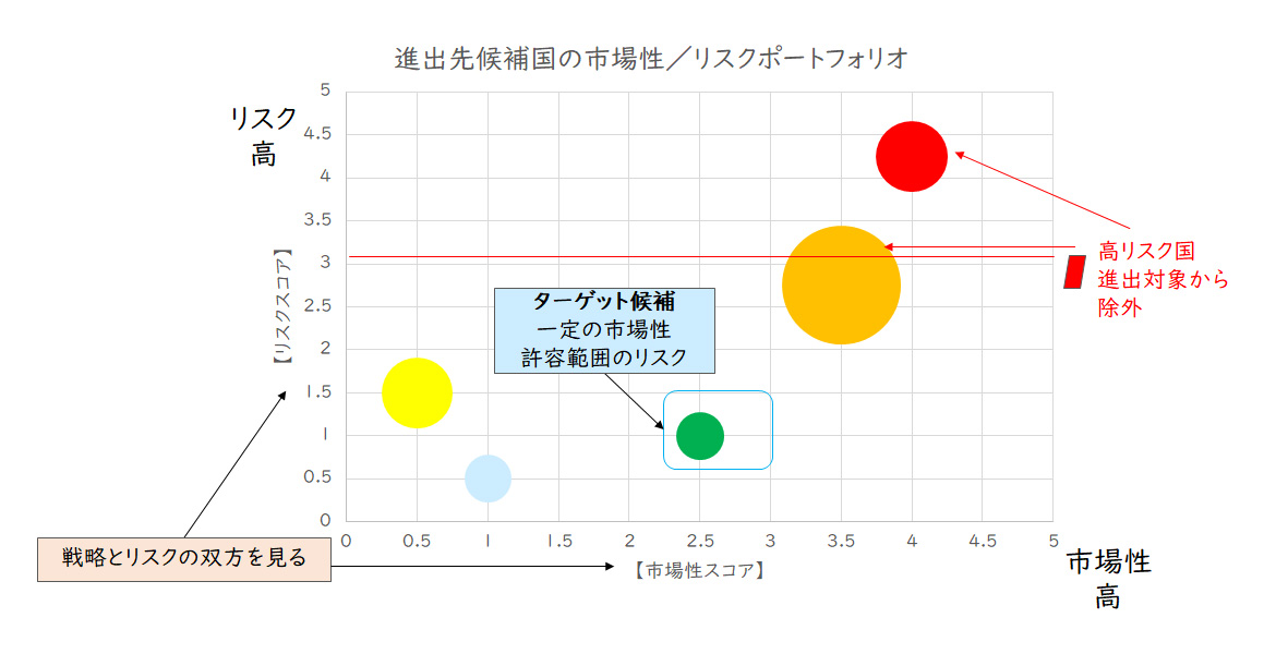 さらに、リスクの観点を市場性・成長性の観点と組み合わせることで、ポートフォリオを作成、双方を視える化し一定の市場有望性があり、かつリスクが許容範囲である国や市場を特定し、意思決定を後押ししました。
