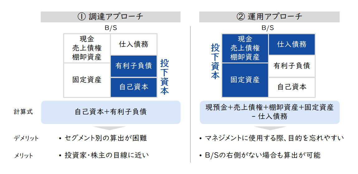 分母となる投下資本については、各事業での算定方法が検討論点となります。投下資本の求め方は、①調達アプローチと②運用アプローチの2つがあります。各事業でROICマネジメントを行う場合には、B/S左側(売上債権、棚卸資産、固定資産、仕入債務)のみで算定できる、②運用アプローチを採用することが多いようです。