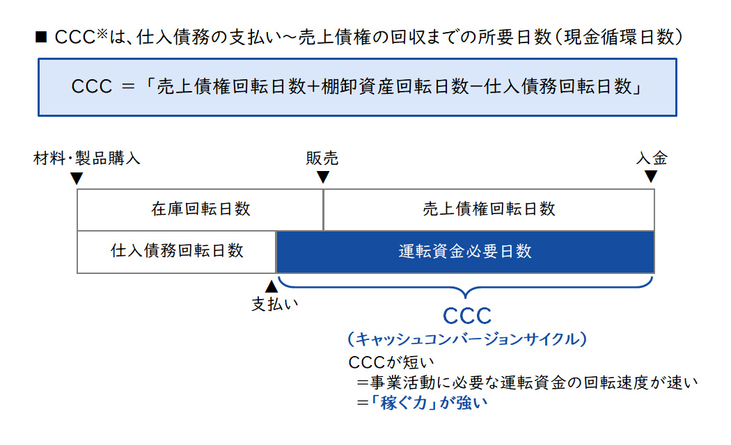 CCCとは、キャッシュコンバージョンサイクル(Cash Conversion Cycle)の略で、仕入債務の支払い~売上債権の回収までの所要日数(現金循環日数)です。つまりCCCは、仕入→製造→出荷→請求→入金といったビジネスの一連の流れを運転資金が1回転する日数のことです。CCCが短い=運転資金が回転する速度が速い=少ない元手で多く稼げる=「稼ぐ力」が強いということになります。