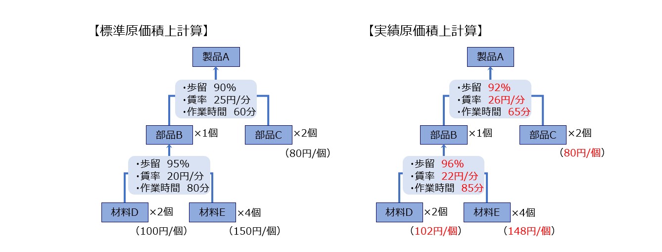 実績原価計算は、標準原価計算において部品表や作業標準表(工程手順表)等を使って下図のように積上計算を行う考え方を利用し、単価・消費数量・賃率・作業時間・歩留等の原単位を実際の数値に置き換えて積上計算を行う考え方です。標準原価計算を採用している企業で、原価差異分析を詳細に行う場合に適した原価計算といえます。