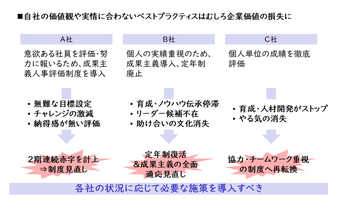 戦略を立てる際に、他社の成功事例やベストプラクティスの導入を考えがちですが、当社ではこの方法には高いリスクが伴うと考えています。例えば、A社がアメリカの成果主義評価制度を導入した際には、目標設定の容易化やチャレンジの回避、評価者の対応不足といった問題が生じ、2期連続赤字に至りました。B社では個人実績重視と定年制廃止により、育成モチベーションの低下や若手育成の停滞、協力文化の喪失といった課題が発生しています。C社も同様に、育成停止とモチベーション低下により制度の再見直しを余儀なくされています。