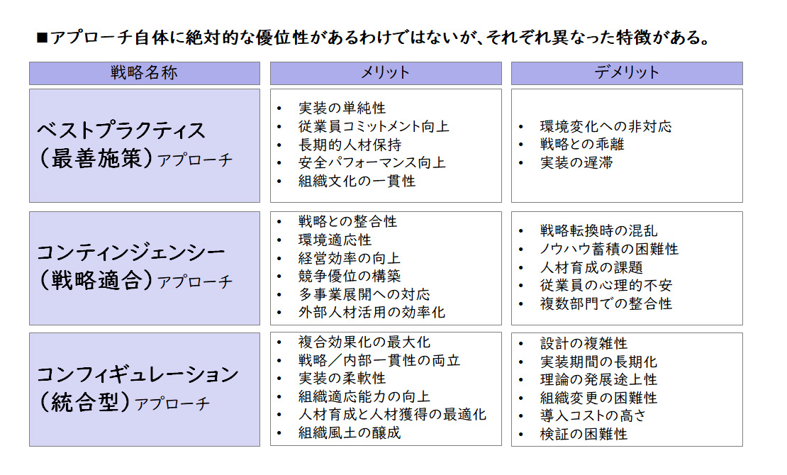 ベストプラクティスアプローチに対抗する考え方で、企業の戦略や事業部によって有効な戦略が異なるという立場に立ち、最適な施策を探索する方法です。戦略との適合性を最優先するため、経営効率の向上や他事業部への展開が可能です。しかし、安定感がなく、従業員を振り回してしまう側面があります。