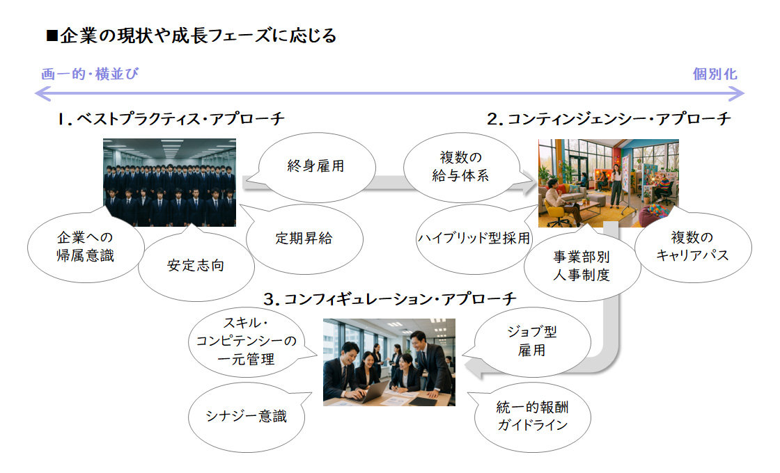 企業の成長段階に応じて、適用すべき人事戦略アプローチは変化します。安定性が求められる企業にはベストプラクティスアプローチが適しています。複数の給与体系やハイブリッド型採用が必要になると、個別最適なアプローチを採る必要が出てきます。グローバル化を目指し、グループ全体で一貫した戦略が必要な段階では、コンフィギュレーションアプローチの導入が求められます。